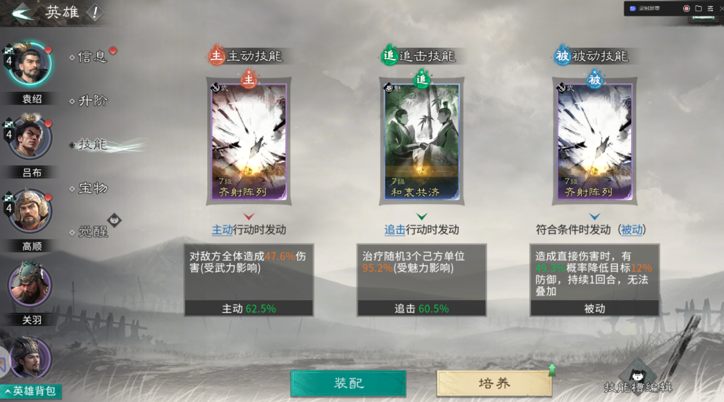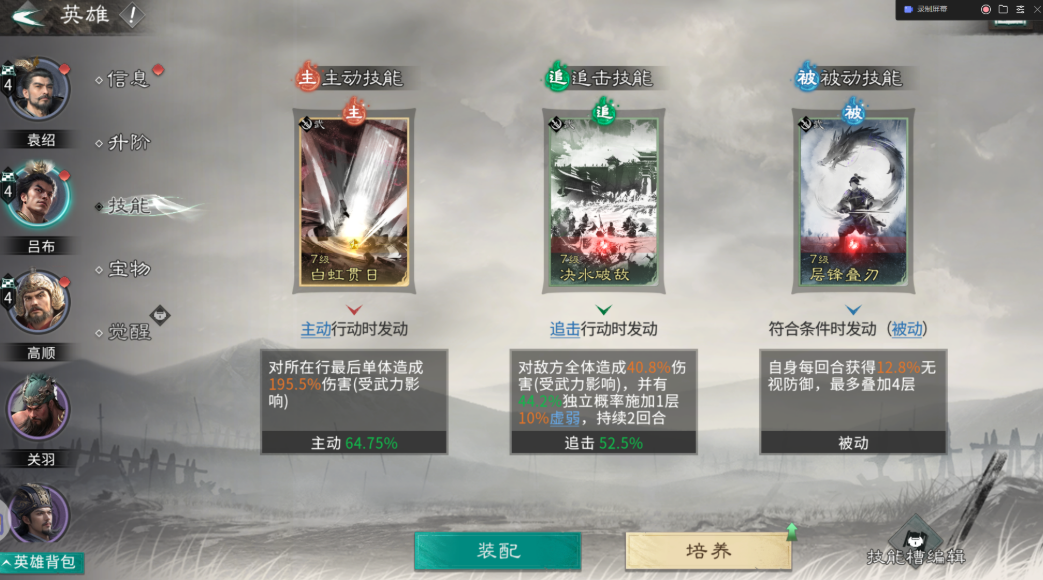 技能配置需严格匹配角色功能定位:高顺被动必选【一夫当关】,以牺牲部分输出换取极致坦度;主动技能推荐【首尾相援】,兼顾回血与减伤,保障其持续站场能力。吕布主动技锁定【白虹贯日】,专注打击敌方后排脆皮单位;追击技选用【决水破敌】,附加虚弱效果以压制对手血线;被动技能配置【层锋叠刃】,随攻击次数叠加无视防御效果,越战越强。袁绍主动与被动均推荐【齐射阵列】,兼顾压血与破防;追击技选择【和衷共济】,提供团队治疗,补足辅助维度。