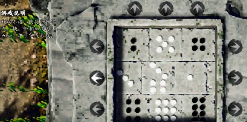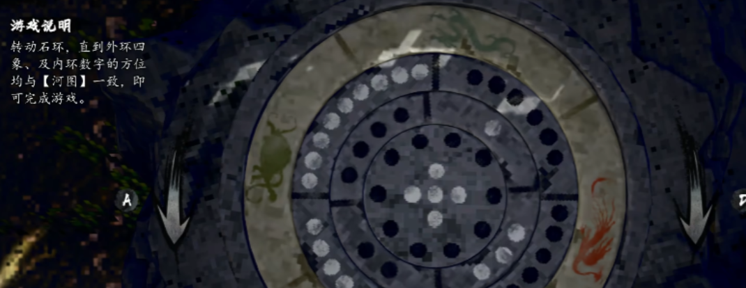 首关为三层嵌套石环装置,目标是使内外两环数字排列完全吻合河图洛书结构。方位严格对应:上为朱雀、下为玄武、左为青龙、右为白虎;数字分布亦有定式——玄武位(下方)为黑6与白1,朱雀位(上方)为白7与黑2,青龙位(左侧)为黑8与白3,白虎位(右侧)为白9与黑4。核心机制在于三环间的传动比:外环每转1圈,内环同步转动3圈;中环每转1.5圈,驱动外环完成1圈;而内环每转1圈,则推动中环偏移0.5圈。掌握该比例关系,是破局的前提。