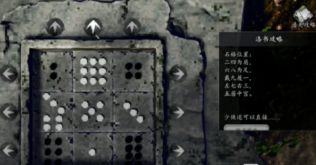 第二关为标准三阶幻方布局谜题,要求横、竖、斜三条线上的数字之和均为15。解法明确且稳定:将数字5置于中心格;9与1分别置于顶部与底部;7与3分列左、右;2与4位于左上、右上两角;6与8则落于左下、右下。即遵循“戴九履一,左三右七,二四为肩,六八为足”的经典口诀。此阶段脱离旋转联动机制,仅需逻辑定位与静态摆放,操作门槛显著降低,适合在前序机关消耗较大精力后平稳过渡。