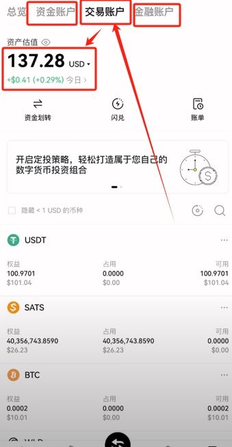 点击右下角的【资产】,上方选择交易账户,这里就可以查看我们购买的比特币。