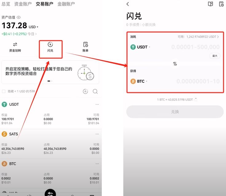 现在我们的交易账户里已经有足够的U去买比特币了。怎么去进行购买呢?可以直接点击【闪兑】,这个闪兑相当于你输入需要买的U,然后他直接就给你兑换成比特币。但这种方式并不推荐,因为它会有一些损耗,价格并不是很好。但是如果你比较着急,想立刻就要比特币,你就可以通过这种方式来操作。