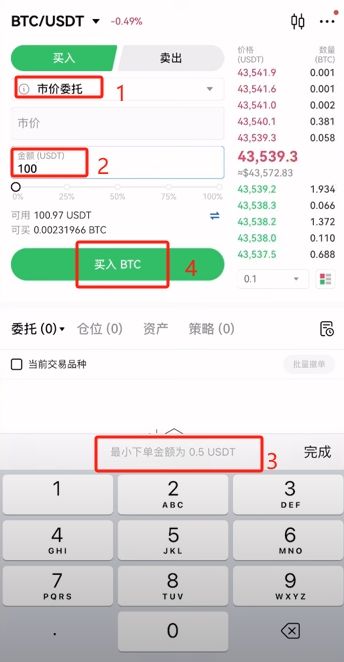 这里我就以选择“市价委托”为例来进行一笔交易,比如说我买100个USDT的比特币。下方显示“最小下单金额0.5USDT”,也就是说,我们买比特币其实只要超过了0.5U就能购买。也就是说现在虽然比特币的价格很高,但是没关系,因为我们不必一次购买1个比特币,或者必须购买0.1个比特币。最少0.5U就能够买比特币了,所以这一点还是很好的。我们输入100U之后,点击【买入BTC】就立刻下单成功了,现在就已经完成交易了。