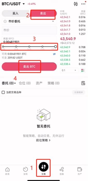 如果想把比特币卖掉也是同样的道理。进入到交易页面,点击【卖出】,比如说我们想把所有的BTC都给卖掉,就把这个百分比给拉满,点击【卖出BTC】就可以把比特币换成USDT。