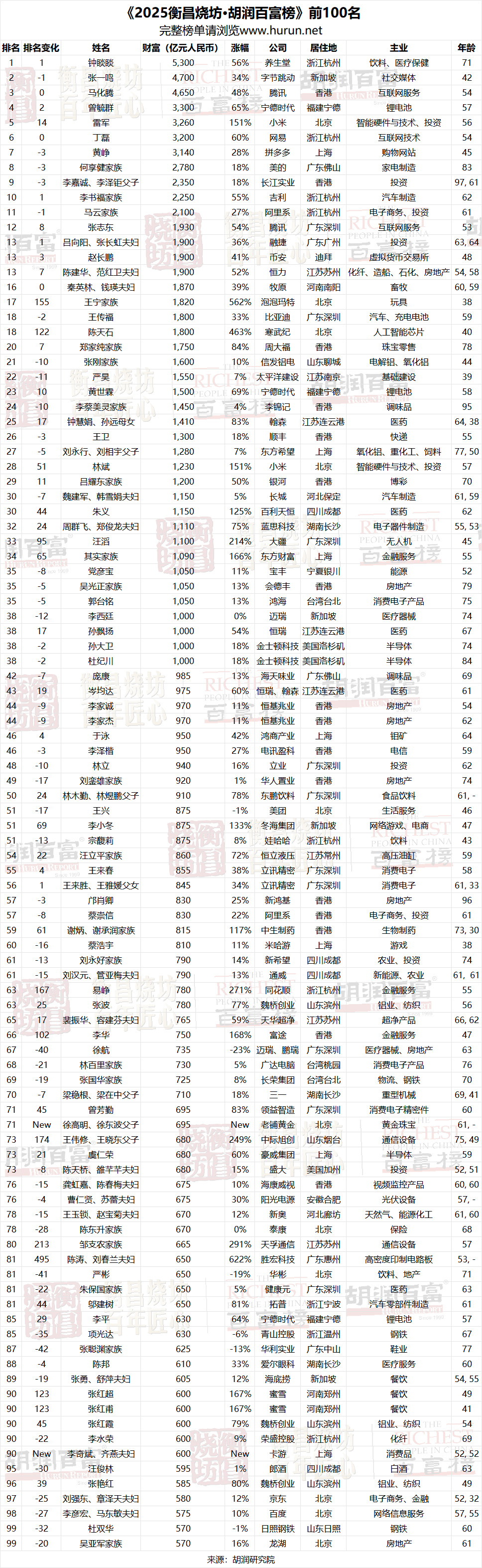 钟睒睒蝉联中国首富,拥有农夫山泉、万泰生物等品牌的他,身价年增56%,达到5,300亿元r民币。位居次位的是字节跳动的张一鸣,4700亿r民币身价,年增34%。第三名是腾讯马化腾,身价年增48%来到4650亿r民币。