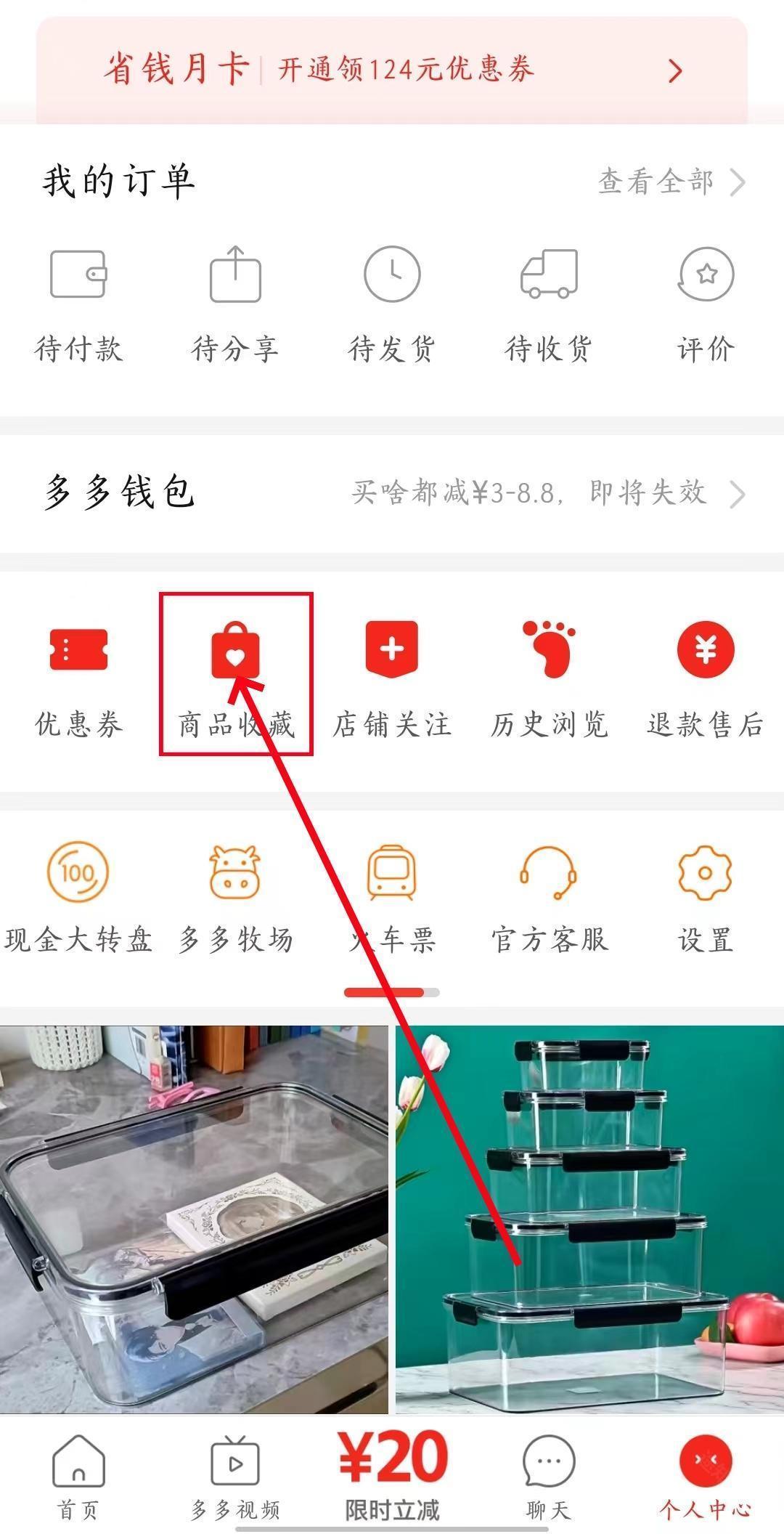 2、退出商品页面,点击右下角【个人中心】,选择【商品收藏】。