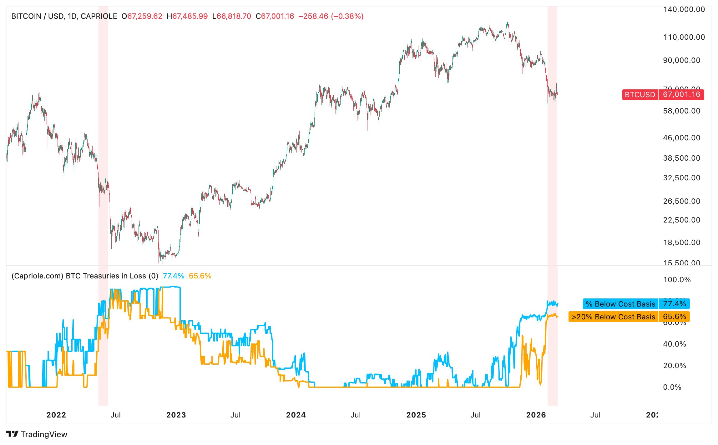 数据显示,比特币价格下跌已导致多数国债公司陷入亏损状态,其中65%的公司持仓成本较当前价格低20%以上。