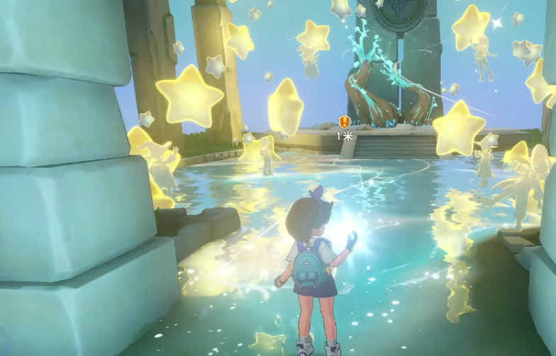 首个高辨识度彩蛋位于“星辉之湖”区域——一处悬浮着点点星光的静谧水面。当玩家步入其中,脚下泛起涟漪,空中随即浮现半透明的经典精灵影像,如迪莫、小火龙、圣光迪莫等标志性角色依次闪现;同步响起的正是页游原版BGM,每靠近一个影像,还会触发对应角色的语音台词,形成视听联动的怀旧体验。