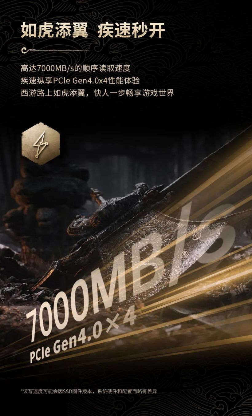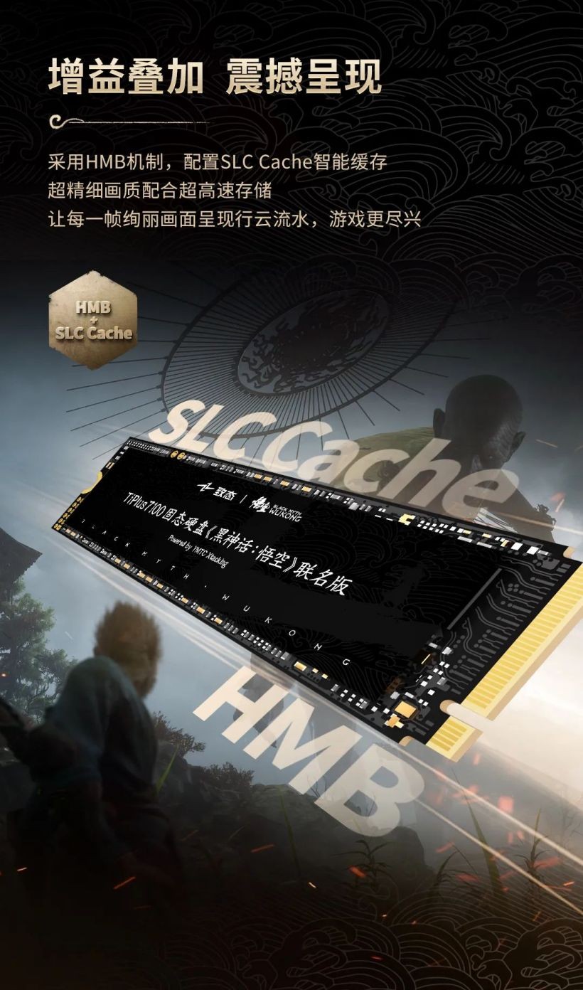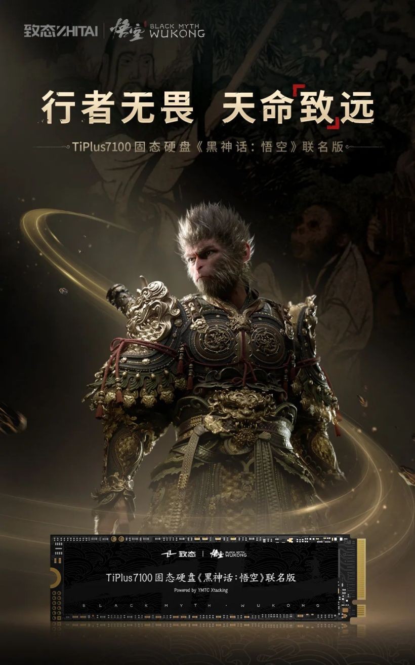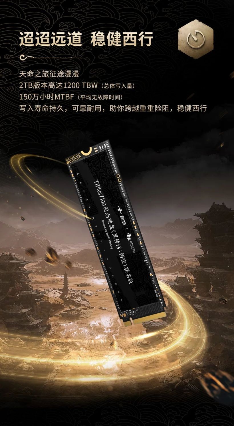 致态 TiPlus 7100 固态硬盘《黑神话:悟空》联名版即日起正式发售,1TB 定价 629 元,2TB 定价 1099 元,附官方一图知如下:
