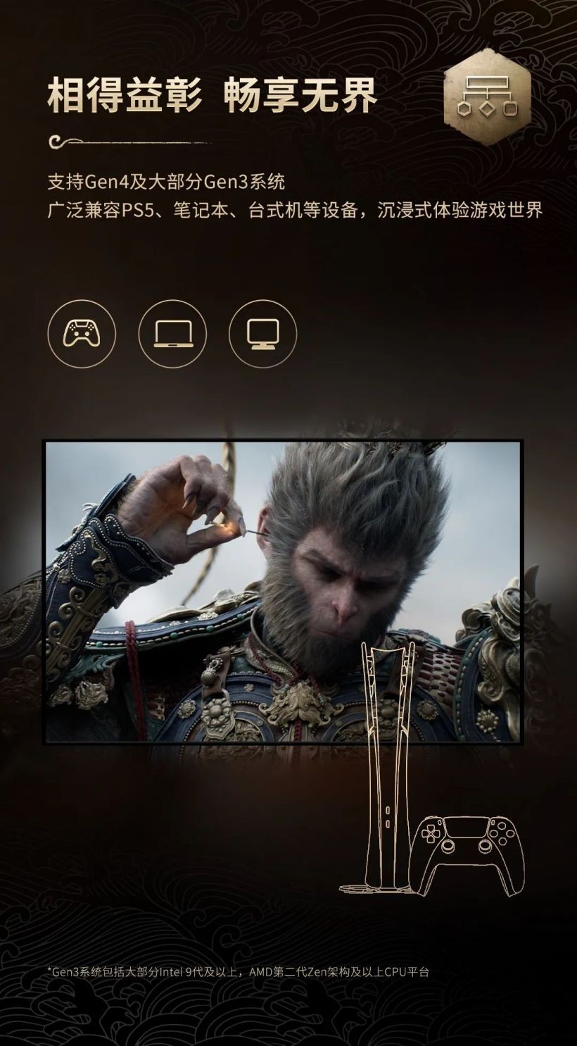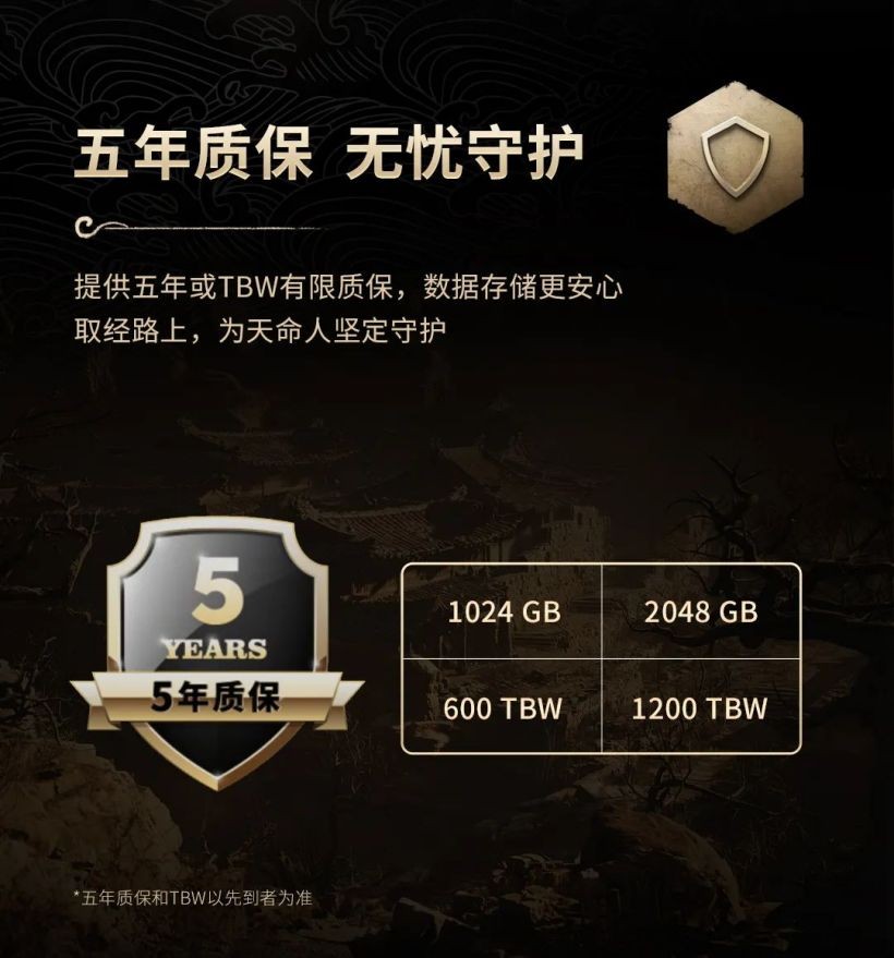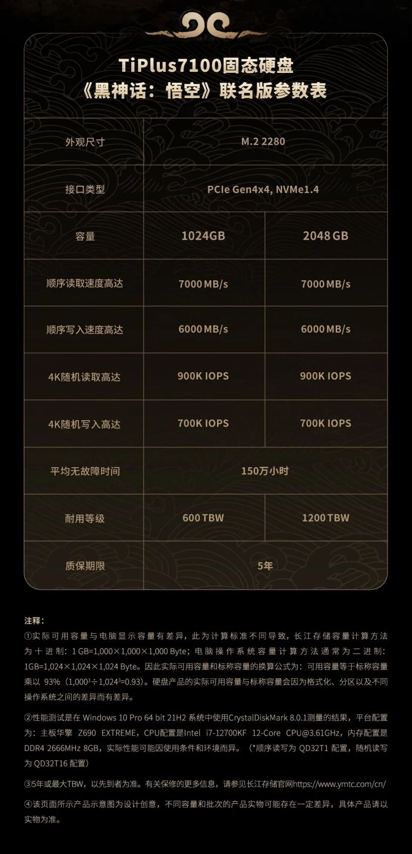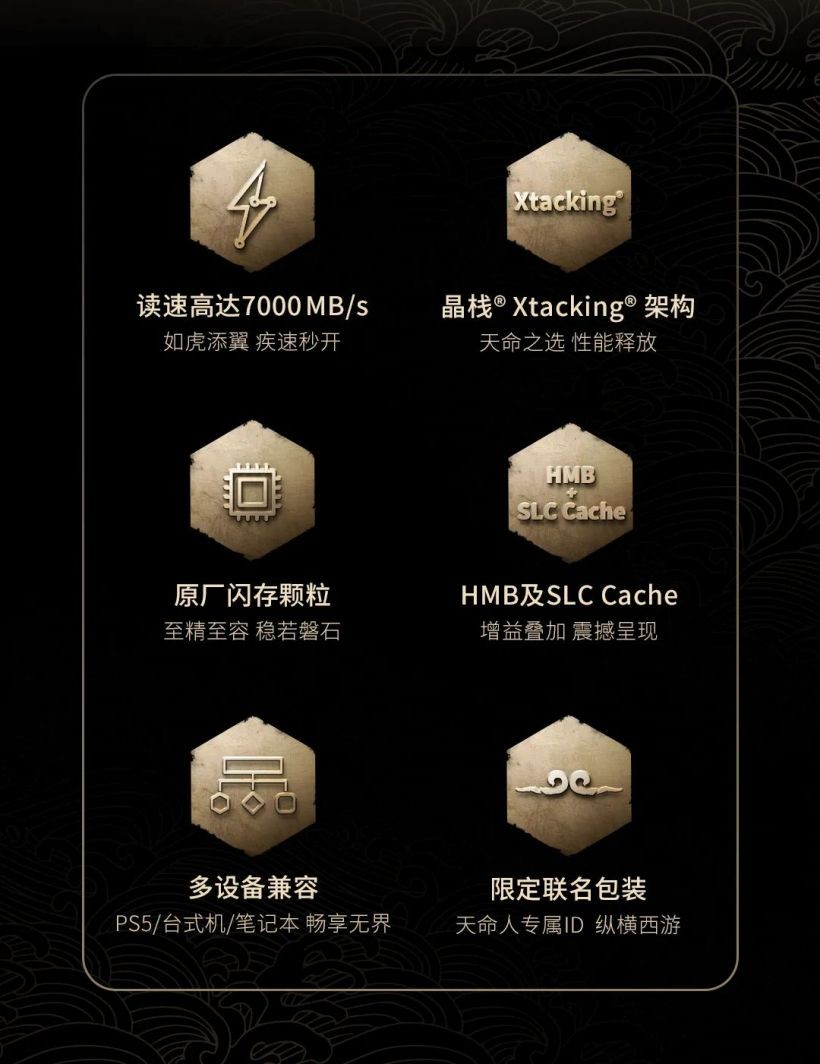 致态 TiPlus 7100 固态硬盘《黑神话:悟空》联名版即日起正式发售,1TB 定价 629 元,2TB 定价 1099 元,附官方一图知如下: