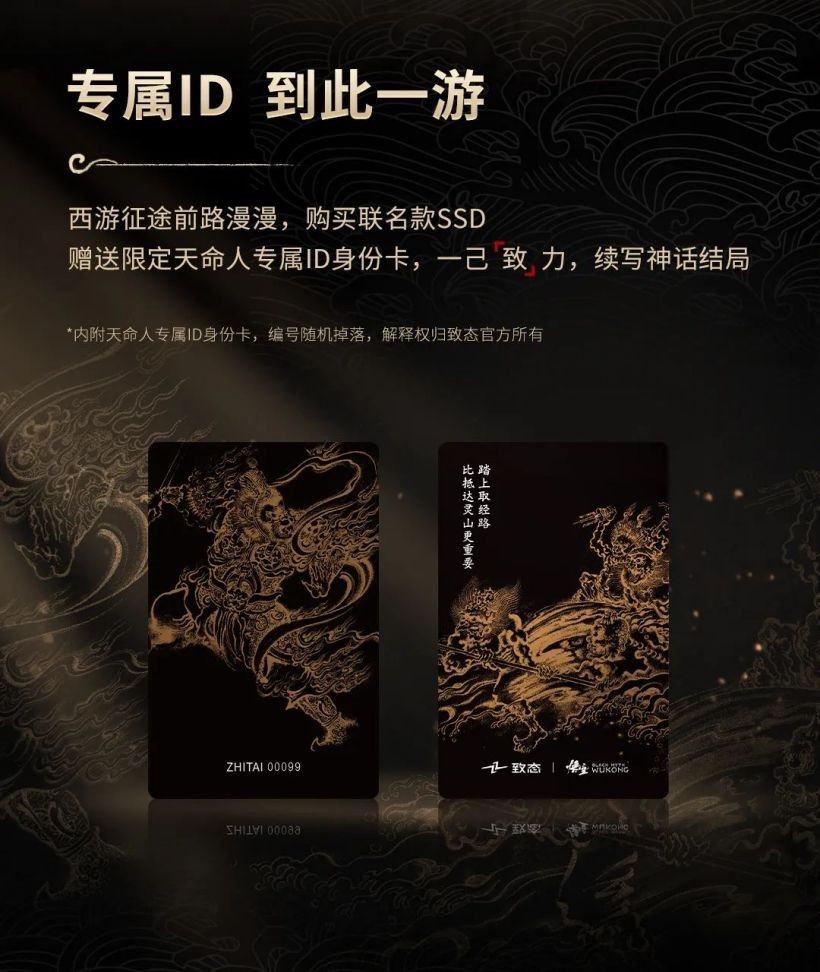 致态 TiPlus 7100 固态硬盘《黑神话:悟空》联名版即日起正式发售:1TB 定价 629 元,2TB 定价 1099 元,本次联名新品外包装以黑色为主,整体采用中国传统的重墨技法,用毛笔勾勒出两条线条,辅以由水墨笔触所描绘的云海底纹。此外,硬盘本体上写有联名相关字样,还有限量“天命人专属身份卡”。