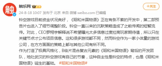 采访中提到,铃空一直以来的沉默策略造成了之前“解散传闻”的短暂流传。对此,罗翔宇解释说不希望曝光太多信息过度拉高玩家期待值,所以只在关键节点才公布项目信息。这和很多游戏都不同,然而铃空作为一家小体量的游戏公司,在方方面面的策略上都与其他公司有所不同。