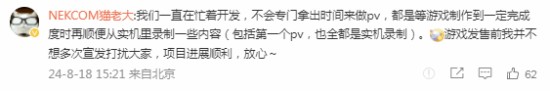 罗翔宇本人也现身评论区,表示“我们一直在忙着开发,不会专门拿出时间来做pv,都是等游戏制作到一定完成度时再顺便从实机里录制一些内容(包括第一个pv,也全都是实机录制)。游戏发售前我并不想多次宣发打扰大家,项目进展顺利,放心~”