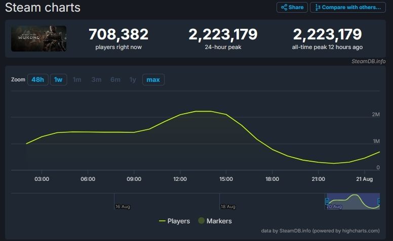 Steam 第三方数据网站 Steam DB 统计显示,《黑神话:悟空》在 Steam 上市首日最高同时上缐人数达到了 222 万 3179 人,已经超越了《幻兽帕鲁》的 210 万最高同时上缐成绩,《黑神话:悟空》目前成为 Steam 史上第二高同时上缐的游戏作品。目前第一名仍是《绝地求生 PUBG》的 325 万人。