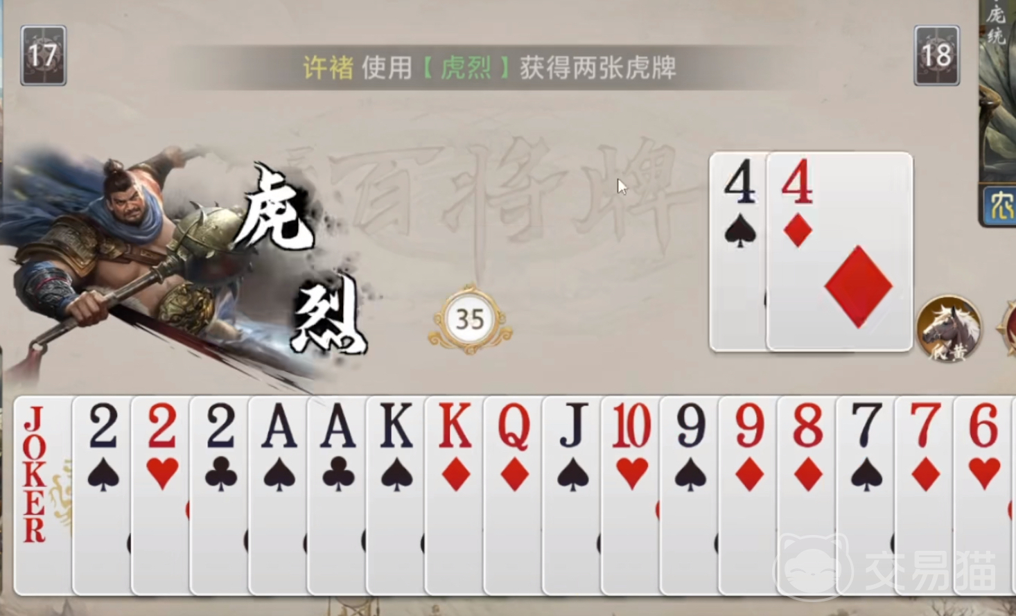 许褚定位为魏国核心输出武将,拥有两个相互协同的核心技能:【虎烈】与【裸衣】。其中【虎烈】为回合内主动技——在你的出牌阶段,可选定一张手牌中点数≤9的对子(如33、77),将其标记为【虎牌】;随后当你完成一次出牌动作后,该【虎牌】将自动触发一次点数跃迁,随机+1至+3点,但上限恒定为【2】(即最高变为22)。该机制本质是将低价值对子转化为高威胁组合,有效缓解手牌冗余压力,提升单回合出牌效率与压制力。