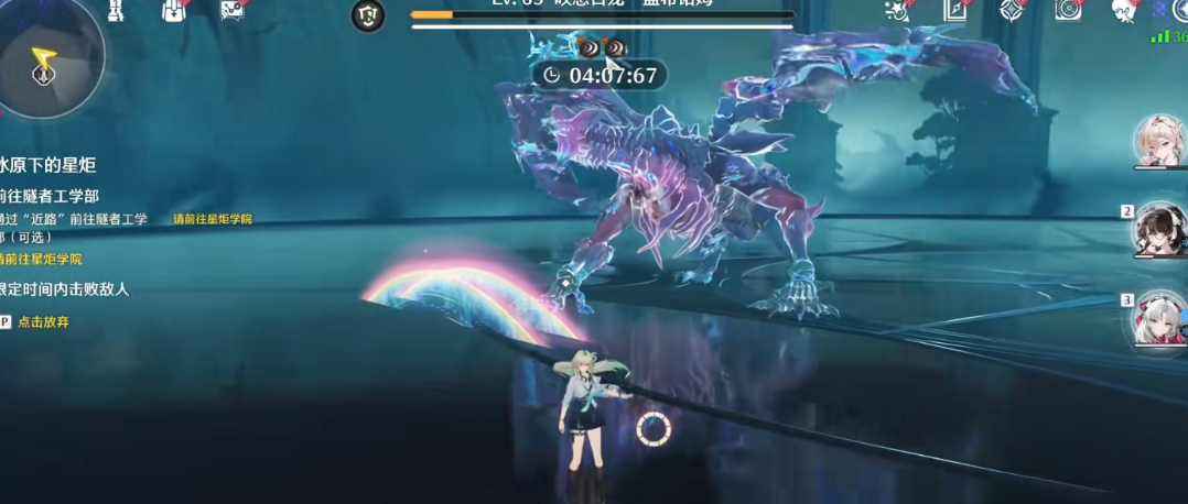 等韧性条被打空,敌人就会进入瘫痪状态。这时候韧性条会变成黄色,开始慢慢往下掉,把它当成倒计时就行。等黄色条跑完之后,敌人就会从瘫痪里恢复,敌人血条左边有个盾牌图标,外面还有个环。咱们在攻击敌人的时候,这个环里面会慢慢涨一条黄色的条,这个就是偏谐值。等咱们把偏斜值打满,敌人血条会像被冰封一样,这时候会进入失血状态。这时候你点一下对应的键或图标,当前上场的角色就会放一个技能,叫偏谐破坏技,也可以直接叫处决技。等到处决技打完以后,偏谐值会被清空,盾牌图标会变成破损的样子,这时候敌人进入斜度干涉状态,也就是受损状态。