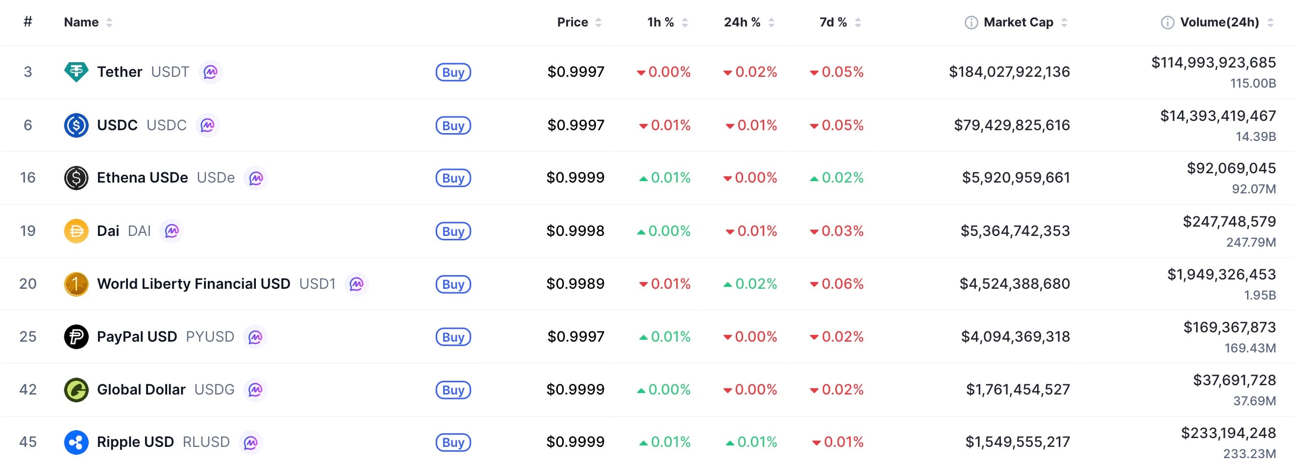 CoinMarketCap数据显示,PYUSD当前稳定币市值排名第六。RLUSD虽位列第八,但日交易量反超PYUSD达25%(2.33亿美元对1.69亿美元)。