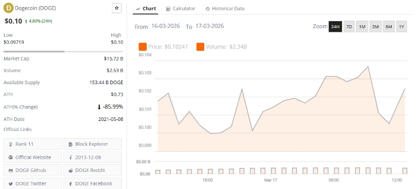 狗狗币现报0.10美元,24小时涨幅4.80%。数据来源:Brave New Coin