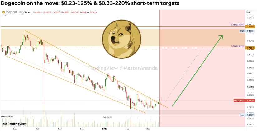 比特币、以太坊和狗狗币集体走强,其中狗狗币在巨量配合、突破性大阳线及市场整体改善的支撑下,可能开启长期看涨阶段。数据来源:TradingView上的MasterAnanda