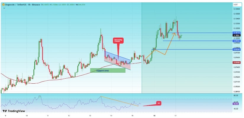 0.097美元、0.099美元和0.101美元等关键短期阻力已陆续被测试,显示价格正逐步推进。但唯有决定性突破才能验证趋势延续。