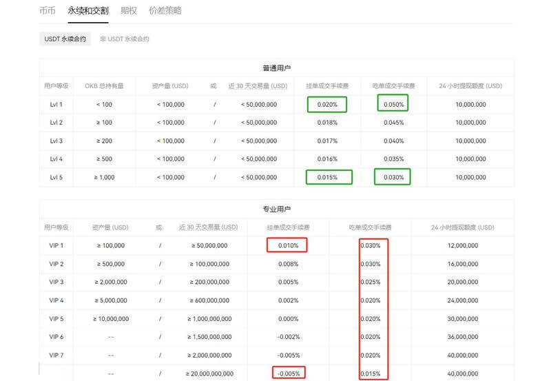 欧易平台将用户分为普通用户和专业用户两个类别,分别根据OKB持仓量和交易量划分等级。不同等级对应不同的日交易费率,且挂单与吃单的手续费存在差异。