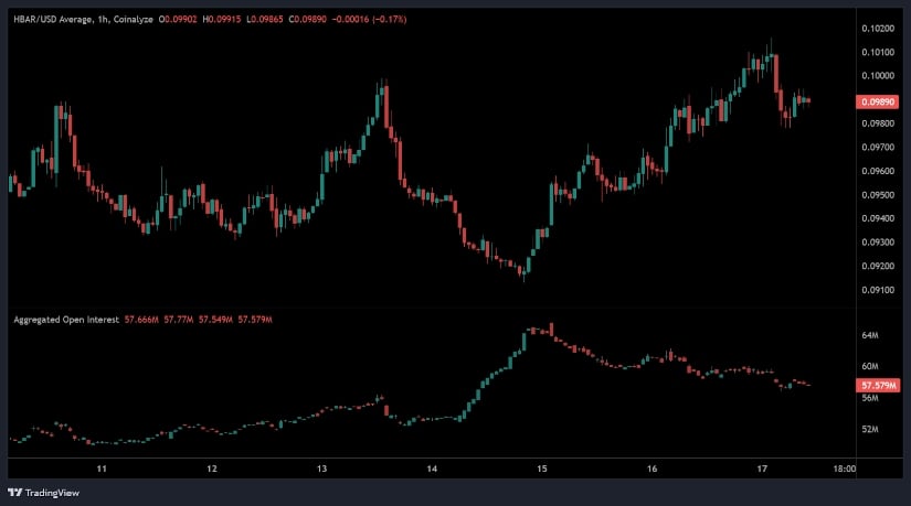 持仓量分析数据显示,Hedera现报0.09890美元,每小时微跌0.17%。图表显示短期上探行情,但价格波动幅度有限,始终在0.091至0.102美元区间震荡。