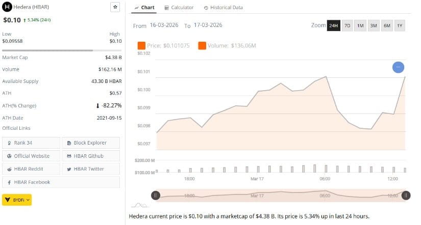BraveNewCoin提供的数据显示,Hedera现价接近0.10美元,过去24小时上涨5.34%。过程中代币在0.09558至0.10美元区间波动。1.6216亿美元的交易量表明市场参与者已重归活跃。