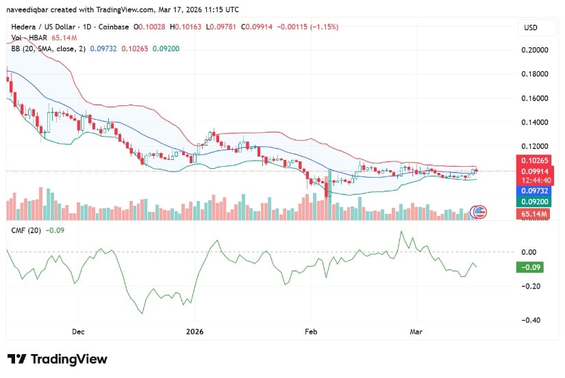 TradingView数据显示,Hedera现报0.09914美元,日内跌幅1.15%。代币仍在0.09732至0.10265美元的狭窄通道内徘徊。这种盘整趋势下,交易者正等待更明确方向。