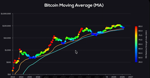 图表通过色点系统将14个月相对强弱指数(RSI)直接映射在价格线上:红色标记周期顶部的超买狂热,蓝色对应投降底部的深度超卖,而黄绿色点则分布于复苏周期及中期扩张阶段。