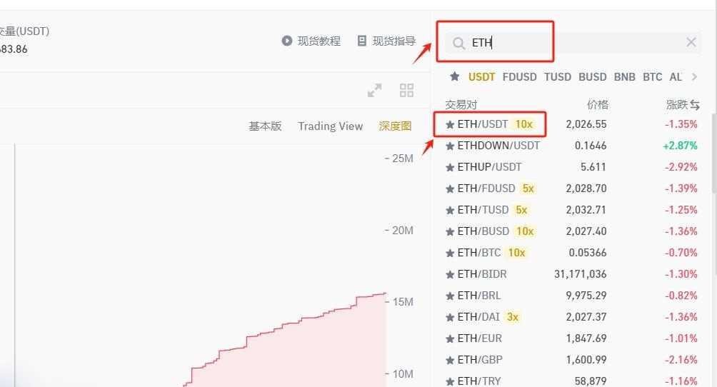 7.搜索"ETH",选择"ETH/USDT"交易对。