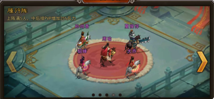 首选推荐阵容为“瞎香队”,核心阵型采用雁行阵。该阵法在五人满编状态下,可提升中后排全体单位25%基础属性,显著强化输出与辅助单元的生存及作用效率。此配置尤其适用于高强度PVP环境,其成员构成包括夏侯惇、孙尚香、周瑜、大乔与貂蝉。其中,夏侯惇作为前排核心,具备高量级护盾生成能力,其主动技能“煞气护体”可吸收相当于自身最大生命值45%的伤害,并在后续10秒内对攻击者造成18%反伤效果,兼具承伤与压制双重价值,是当前版本中坦度与功能性兼备的优质前排选择。