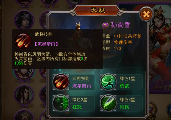 孙尚香担任主输出位,推荐部署于中排弓兵位置。其核心技能“流星剑雨”具备三段群体物理伤害,每段均造成105%攻击力的范围打击,能高效压制敌方中后排站位。该技能释放节奏快、覆盖密度高,配合雁行阵提供的中排增益,可最大化聚气效率与大招命中率。需注意:当敌方存在强突进或高频单点压制时,应优先保障前排稳定性,避免输出链被强行打断。