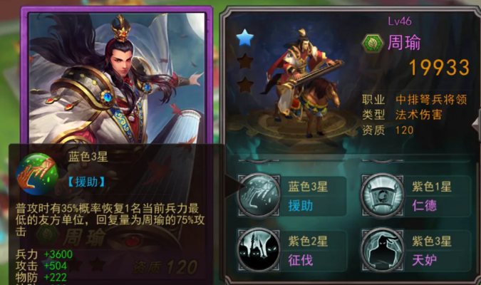 周瑜虽为中排弩兵将领,法术伤害输出偏低,但其援助类技能在“瞎香队”中承担不可替代的支援职能。在雁行阵加持下,其治疗触发频率与恢复量均得到稳定保障,成为维系整支队伍作战持续性的关键节点。