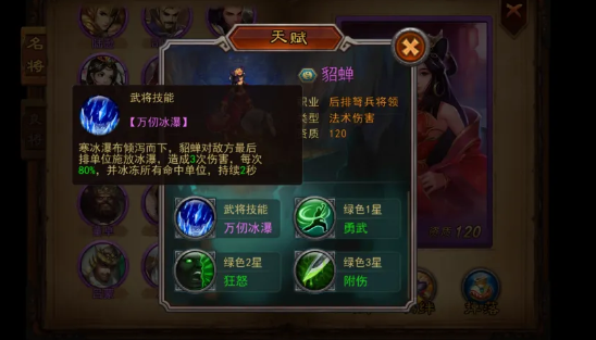 貂蝉负责战局控制,部署于后排可最大化发挥其冰冻压制能力。其技能“万仞冰瀑”对敌方最末排全体目标施加连续三次打击,每次造成80%攻击力的伤害,并附带2秒冰冻效果。虽然单次控场时间有限,但其高频率触发特性与多段判定机制,可有效衔接其他武将技能,形成连环控制链,大幅削弱敌方后排输出节奏与技能释放自由度。
