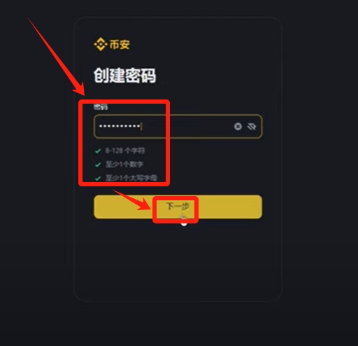 创建密码时需满足三项核心要求:8-128个字符长度、包含至少1个数字和1个大写字母。每项条件达标后会有绿色标记提示,全部符合才能进入下一步操作。