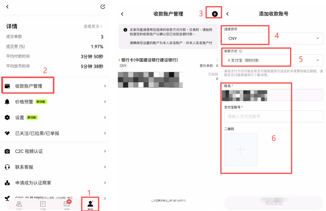在"我的-收款账户管理"中添加支付宝或银彳卡等收款方式。注意收款账户必须与实名认证信息保持一致。