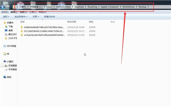 第二步按顺序访问Users→administrator→AppData→Roaming→Apple Computer→MobileSync→Backup,最终在该目录下可查看全部备份文件。