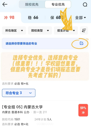 第五步系统会展示符合条件的院校列表,注意顶部可切换【院校优先】或专业优先模式,右侧标注的录取难度需重点关注。