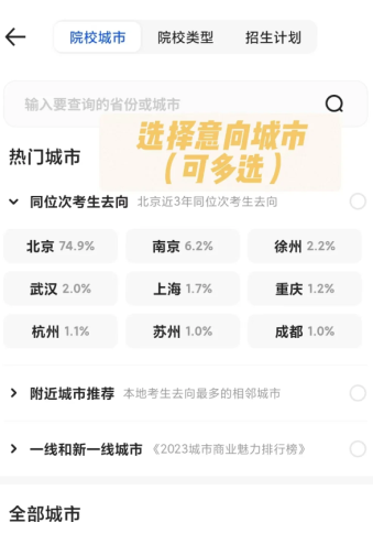 第四步可多选就读城市,系统将综合地域偏好进行院校推荐。