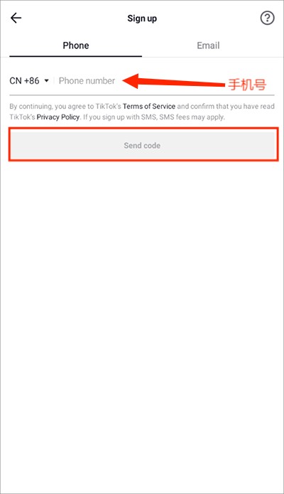 4.输入有效的手机号码或电子邮箱,点击"Send code"按钮完成验证流程