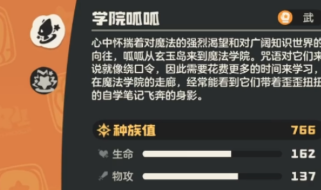 学院呱呱采用均衡型三维成长模型,生命值、物理攻击与魔法攻击三项基础数值均处于同阶精灵前列,使其能灵活适配多种对抗场景。防御端表现尤为突出,物理防御与魔法抗性同步维持高位水平,可有效应对常规伤害类型。其专属被动技能“留学生”具有明确的能量管理机制:每次触发消耗2点能量,倒逼玩家对技能释放顺序、回合节奏进行前置规划,显著提升战术决策权重。