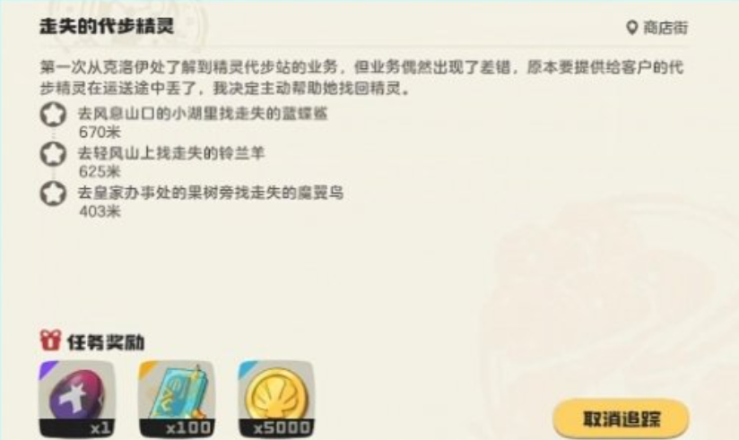 该任务起始于商店街西区。玩家需先传送至可可果旁的传送阵,随后转身即可发现代步站站长克洛伊。与其对话后,将自动接取“走失的代步精灵”任务。据克洛伊所述,三只负责运输工作的代步精灵在途中意外失散,玩家需协助找回全部个体,方可推进任务流程并最终领取恶魔狼蛋作为核心奖励。
