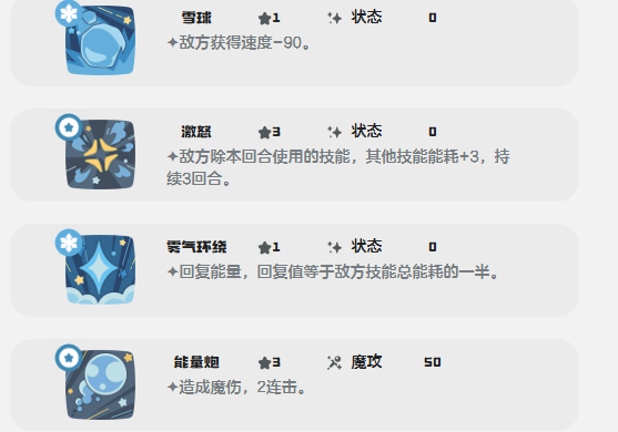技能组设计强调能耗博弈与持续控场。“冰冻光线”附带魔法伤害的同时,额外施加能耗增量;“聒噪”进一步加快敌方攻击类技能的消耗速率,逐步瓦解其行动连续性;而核心大招“冰封横扫”的威力直接挂钩敌方当前总技能能耗,等效于其总能耗数值的10倍。这意味着在敌方频繁使用技能导致能耗累积至高位时,该技能可瞬间打出高额反制伤害。它不依赖瞬发秒杀,却能通过层层能耗压制打乱对手整套战术节奏,是团队中不可或缺的节奏枢纽型辅助。