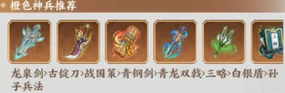 将印搭配好之后,大家考虑阵容里面神兵的时候,推荐大家可以先用橙色的龙泉剑效果不错,没有龙泉剑的话,大家还可以考虑的是古锭刀以及战国策,包括青钢剑或者是青龙双戟也可以搭配,最后实在是没有以上这些神兵,大家就用比较一般的三略、白银盾、孙子兵法前期也可以用,这些神兵的核心能力是优先提高物理普攻伤害,对于阵容来说是最适配的。