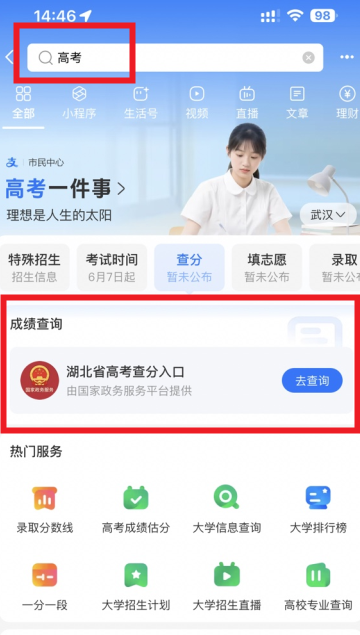 第一步:启动支付宝应用,在顶部搜索栏输入【高考】关键词,进入专题页面后点击查询入口即可。