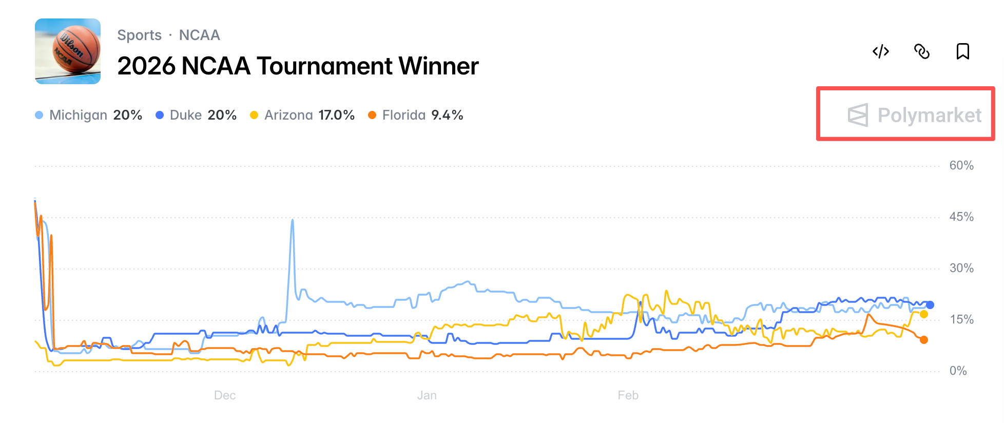 为什么最近Polymarket和Kalshi都投入大量精力来宣传NCAAB?因为疯三在美国有扎实的文化基础,在此期间会获得大量关注。包括Polymarket因为美国大选而出圈,都是乘着热点事件的东风从而事半功倍。