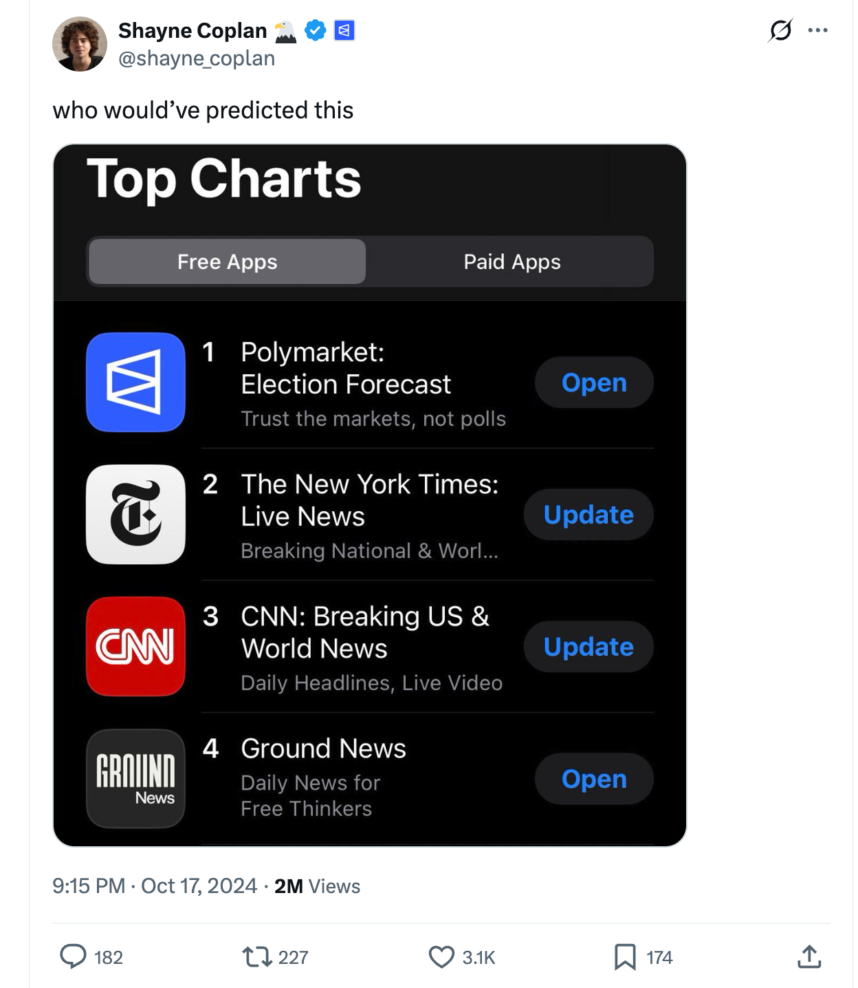 2024年10月,Polymarket登上App Store免费应用第一名。这一事件本身,又通过大量截图引发了新一轮裂变传播。