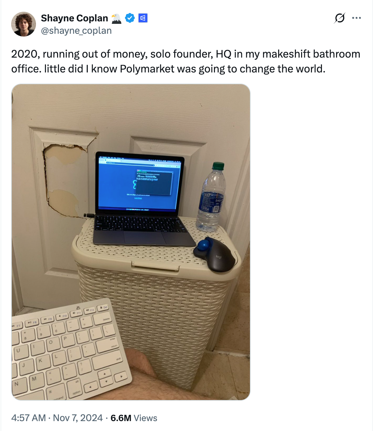 他在X上的自述:"2020年,身无分文,独自一人,办公室就是我那个临时浴室。那时根本想不到Polymarket会改变世界。