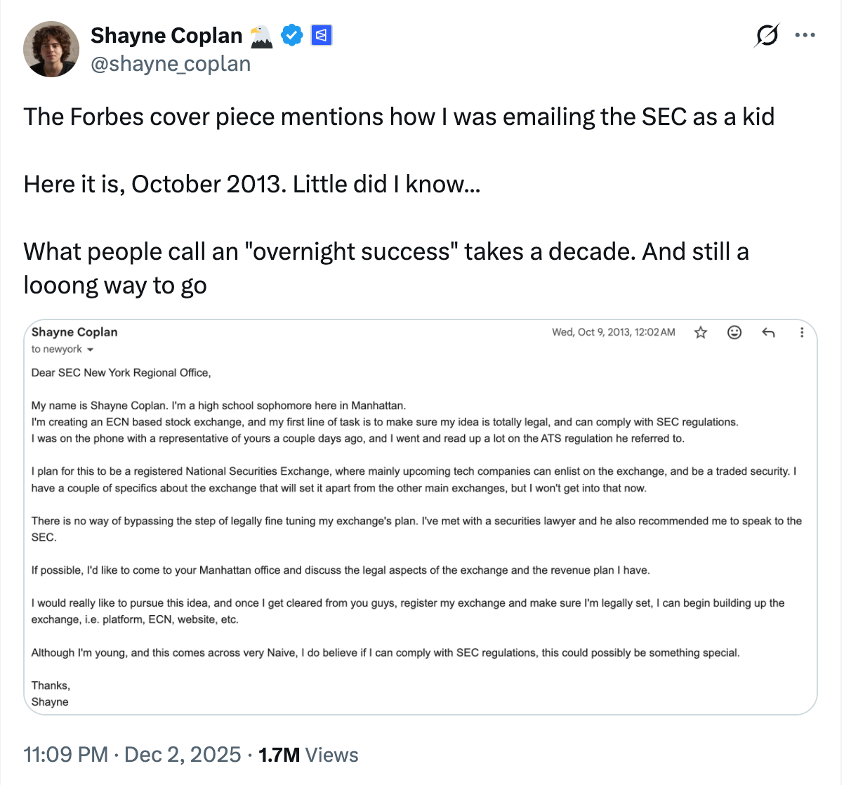 起于微末,但他创业的热情一直未减,早在2013年他还是个高中生时就给SEC写信询问创建一个ECN交易所是否合规,虽然最后也没得到回复。如他所说:一夜成名其实需要十年的时间。截至目前,他的X有16万粉丝,但他推文不晒狗也不晒车更不晒团队,只是一个无情宣传Polymarket的PR机器。