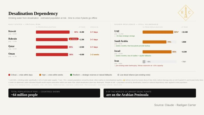 如果美以继续打击生命支撑基础设施,伊朗将对等报复,而随着防空拦截资源日益稀缺,打击这些设施将越来越容易。这是海湾国家和以色列一个不对称的致命弱点。该地区约有6400万人可能受到影响。这将引发一场人道主义和难民危机,与之相比,叙利亚内战都将显得微不足道,其后果将波及欧洲和土耳其。