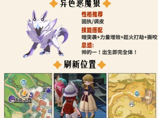 异色恶魔狼固定刷新于商店街西侧区域,与女洛克对话后即可激活其出现条件。推荐性格为固执或调皮,技能搭配暗突袭、力量增效与趁火打劫,形成高爆发物理连段,在副本清图与PVP对战中均表现稳定。另一高人气异色单位伊瑟拉特,具备无限连击特性,战斗节奏流畅、压制感强,刷新点位于望风半岛。性格同样优选固执或调皮,核心技能组合为热身运动、无影脚与反击拳,兼顾启动速度与持续输出能力。